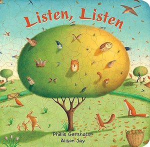 Little M and I love to read. I sometimes think I get more excited about his books than he does, but then he proves me wrong by bringing book after book over to me to read to him. We do have a few favorites, but tend to read quite a variety of books. One of our newest faves is Listen, Listen by Phillis Gershator and Allison Jay. It’s lovely because it walks us through all the seasons, with wonderful rhyming prose and beautiful illustrations. I get excited about picking apples and the fall season when we read it together.