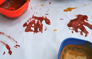 What I love most about this paint, besides the fact that it is such a wonderful natural product, is that the paint colors are truly vibrant and rich. The consistency is creamy and was very easy for Little M to use, as you can see in the photo below. The colors are so bright that they seemed to jump right off the paper! In fact, they sort of did and ended up in Little M’s hair, on his face, and all over his arms and legs!