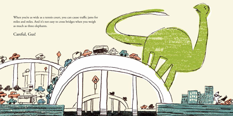 Gus, the Dinosaur Bus, written by Julia Liu and illustrated by Bei Lynn, is a sweet tale about a large, lumbering, green dinosaur with a very special job – as a school bus! Although the kids love having Gus as their bus (who wouldn’t love riding a dinosaur to school?), they quickly discover that a dinosaur might not be the ideal mode of transportation. Poor Gus knocks down traffic lights, gets tangled in phone lines and bumps his head on overpasses.